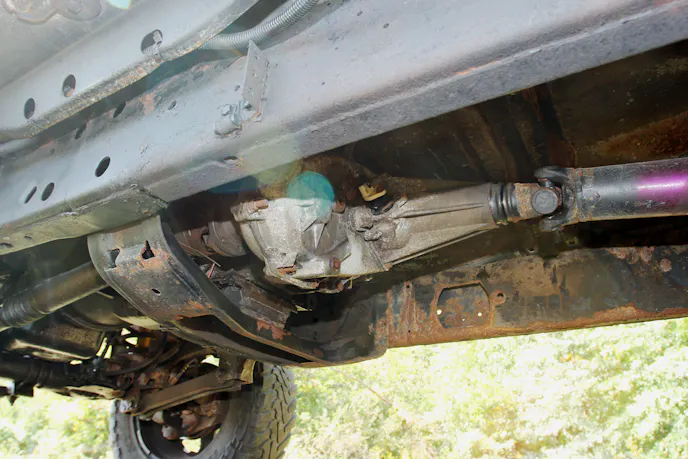 Power flows to an NV4500 five-speed manual transmission with a Valair dual-disc ceramic clutch. An NP241HD two-speed transfer case routes the power to the axles. Up front is a Dana 60 axle, and out back is a Dana 80. Both have 4.10:1 gearing, and the rear axle has a factory locker.