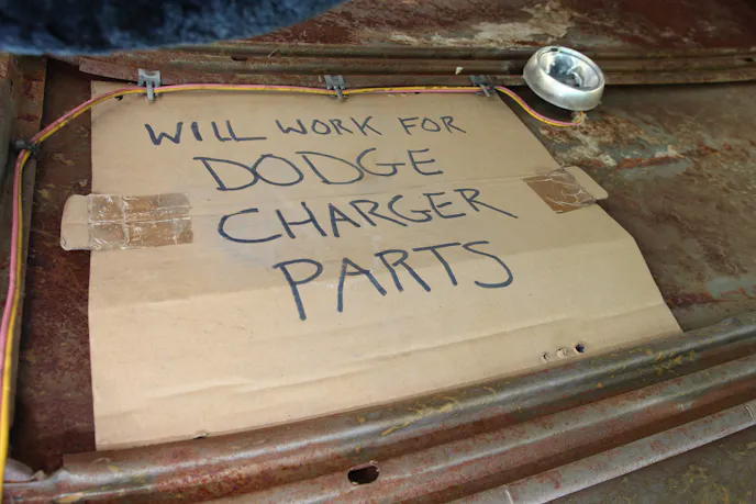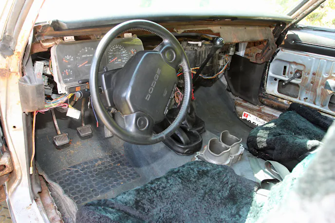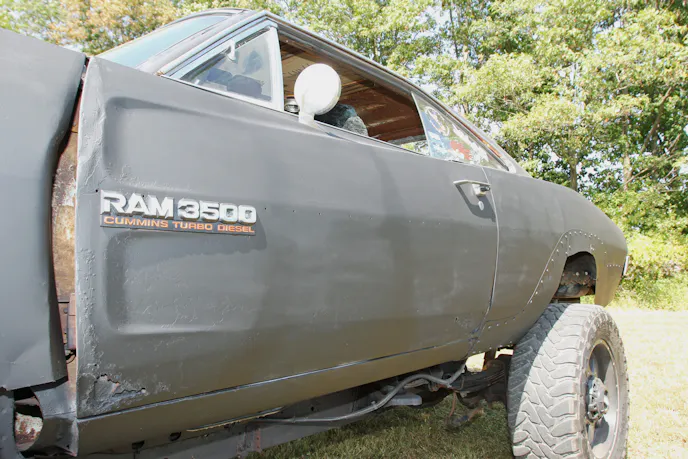 He sourced a 1996 Dodge Ram 3500 extended-cab dually because he wanted the beefy chassis and Cummins turbodiesel engine. But instead of dropping the Charger body onto the chassis, he integrated the Charger bodywork onto the Ram’s components. For example, the vehicle uses the Ram’s firewall, inner fenderwells, floorpan, cargo bed floor, and core support. In fact, the interior carpet is the original carpet from the Ram.