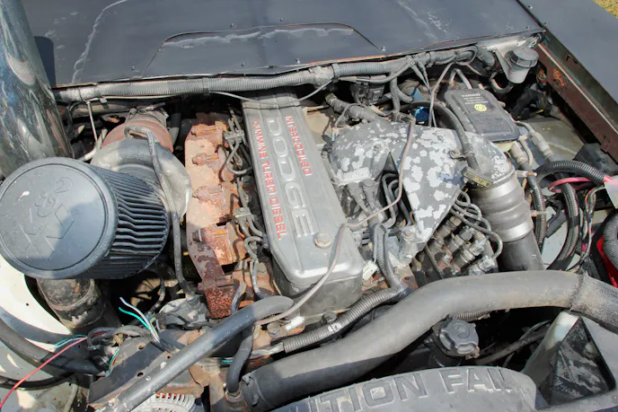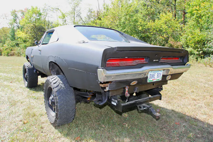 Dave’s 1969 Dodge Charger Cummins 4×4, which he calls “Bulletproof,” isn’t a museum piece or a trailer queen. In fact, he uses the car regularly, no apocalypse required, as shown in the photo above. He reports that it gets 22 mpg with the air conditioning on while pulling a trailer with another Charger on it at highway speeds. He also says it has the driving mannerisms of a 1/2-ton truck.