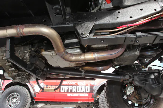 The Jeepster rolls on a leaf-spring suspension with springs built by Euclid Spring. They sit on custom perches with extended shackles, and Rancho shocks handle damping at all four corners. The rear shocks were moved behind the axle to improve ride quality and handling. Up front, the custom steering system uses 1-inch-diameter, 0.125-inch-wall tubing fitted with Heim joints.