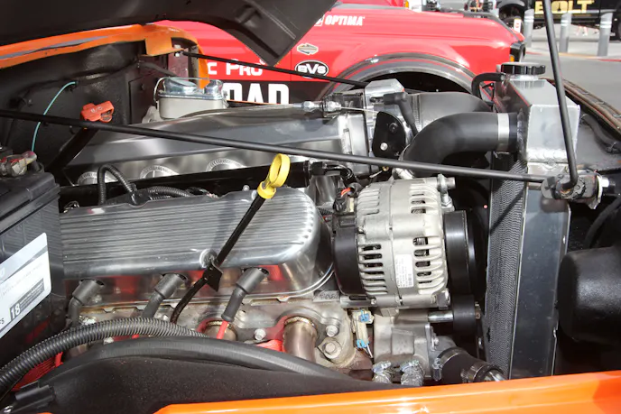 Under the hood sits a GM 5.3-liter LS V8 that replaces the stock Dauntless 225-cubic-inch V6. The 5.3 came from a 2004 Chevy Silverado 1500 that had succumbed to a broken frame. It now breathes through a custom dual exhaust with 2.5-inch-diameter pipes and Summit Racing-sourced mufflers. A custom four-core radiator and a Flex-A-Lite electric pusher fan keep temps in check. To make the swap work, the front of the Jeepster’s frame was widened from the firewall forward, and the front crossmember was relocated to clear the crank pulley and the custom steering system.