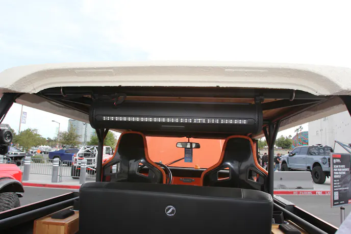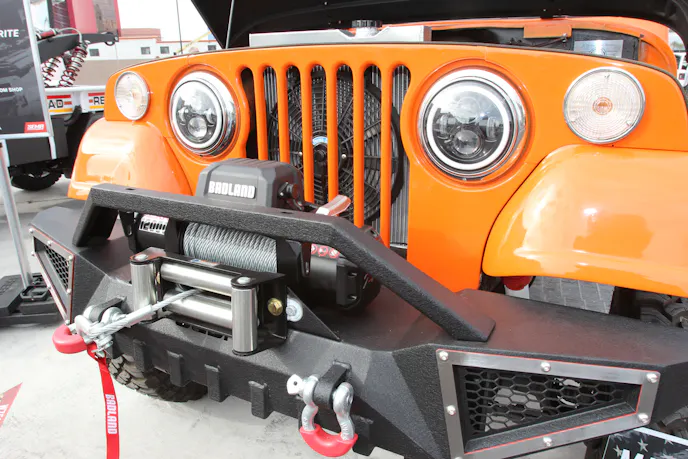 The Jeepster Commando was built to feel at home on- or off-road. Its sun- and rain-repelling custom safari top started life as the factory steel roof and is now lined with a bamboo headliner. Wrangler bumpers were adapted to fit the Jeepster, each fitted with a pair of shackle mounts, and the front bumper carries a Harbor Freight Badland 12,000-pound-capacity winch. Other exterior upgrades include custom fender flares, step bars, LED headlights, and a custom 2-inch hitch receiver.