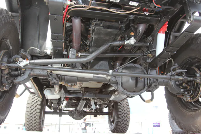 The Jeepster rolls on a leaf-spring suspension with springs built by Euclid Spring. They sit on custom perches with extended shackles, and Rancho shocks handle damping at all four corners. The rear shocks were moved behind the axle to improve ride quality and handling. Up front, the custom steering system uses 1-inch-diameter, 0.125-inch-wall tubing fitted with Heim joints.