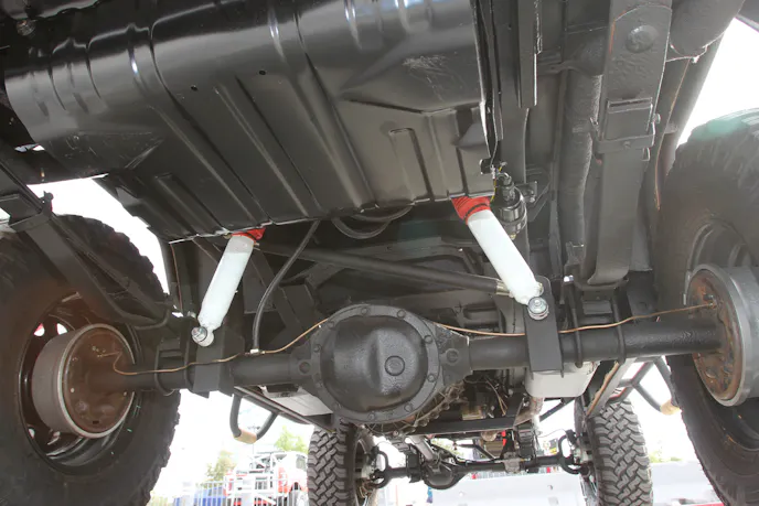 The Jeepster Commando rides on axles sourced from a local seller. Up front is a Dana 35, and out back is a Dana 44. The Dana 35’s vacuum-operated axle disconnect was swapped for a cable-actuated system, and the rear axle carries a limited-slip differential. Both axles turn 4.10:1 gears.