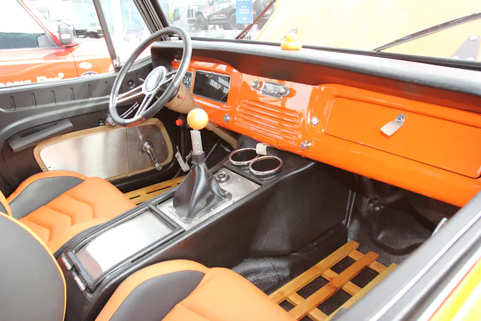 Inside, the Jeepster is a combination of vintage and cutting-edge modern. For example, the factory dash has been reworked, and to the right of the factory switches is an Intellitronix LED digital gauge panel. Down the middle is a custom-designed center console. It houses the transmission shifter, the vehicle’s push-button start button (the rig is also fitted with remote start), a wireless charging system for cell phones, and a pair of cupholders.