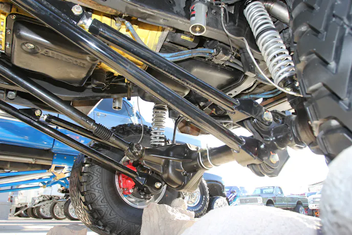 The axles were modified and installed by TrailHunters. Up front is a 2010 Ford F-250–sourced Dana 60, and out back is a Ford 10.25. The Dana 60 is loaded with upgrades, including an Eaton Detroit Locker, Warn manual locking hubs, custom knuckles, and chromoly axleshafts. It also runs an Artec Industries diff cover and high-steer kit. Supporting hardware includes a Thuren Fabrication 6-inch drop sway bar and dual Skyjacker steering stabilizers. The rear axle also carries an Eaton Detroit Locker and Artec diff cover, and both axles turn 4.56:1 gears. Finally, each axle is equipped with PowerStop brakes.