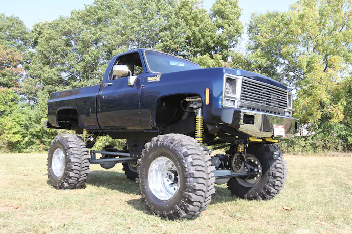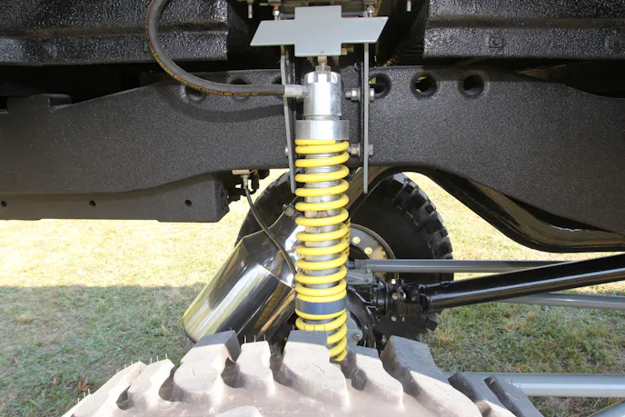 The custom triangulated four-link suspension has link bars made from 0.250-inch-wall DOM tubing. Each Big Shocks remote-reservoir coilover delivers 16 inches of travel and features an adjustable top mount for fine-tuning. The suspension creates plenty of room for the massive 19.5/44-20LT Interco Super Swamper TSL Bogger tires mounted on 14-inch-wide aluminum wheels custom-made by Real Racing Wheels.