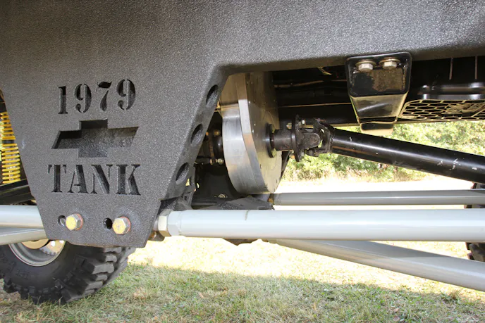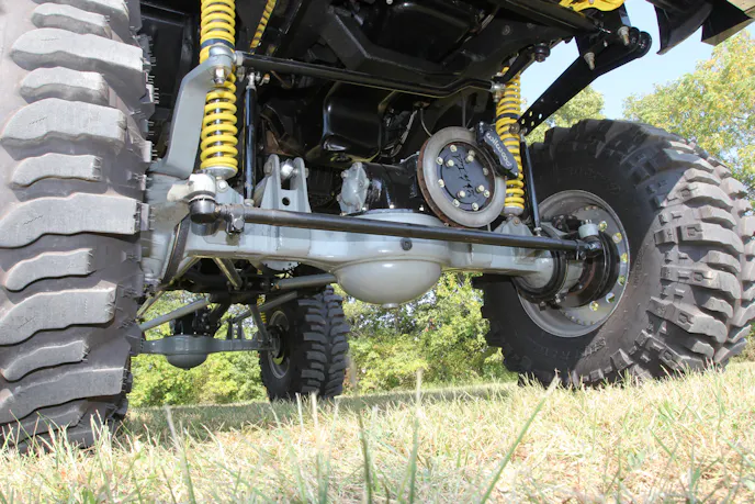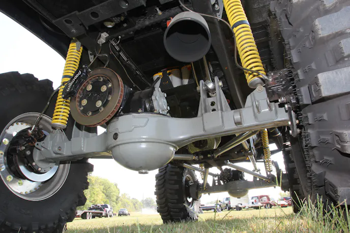 The custom triangulated four-link suspension has link bars made from 0.250-inch-wall DOM tubing. Each Big Shocks remote-reservoir coilover delivers 16 inches of travel and features an adjustable top mount for fine-tuning. The suspension creates plenty of room for the massive 19.5/44-20LT Interco Super Swamper TSL Bogger tires mounted on 14-inch-wide aluminum wheels custom-made by Real Racing Wheels.