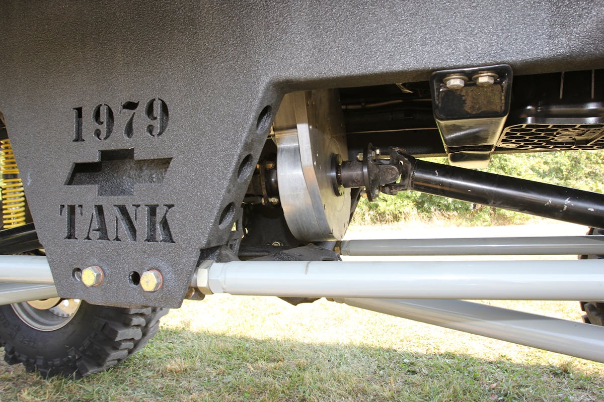 The truck’s backbone is a custom-built frame. Forrest started with Chevy longbed framerails, shortened them, fully boxed the frame, and added 2.5 inches of height to ditch the need for a body lift. The custom chassis packs crossmembers made from 2×4- and 2×6-inch steel for ample strength. Down low, a hand-built drop subframe cradles the SCS gearbox and doubles as the central mounting point for the suspension link bars.