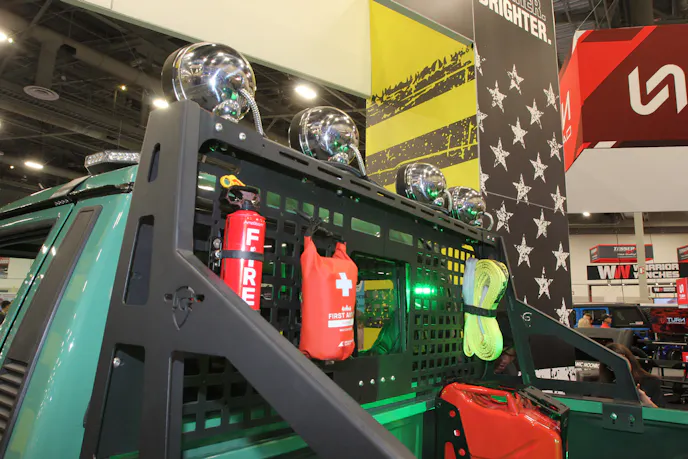 Outside, the Comanche sports a Mantis Green vinyl wrap, Notch Customs M-Max fender flares, and Oracle Lighting LED taillights. To light up the trail, Brad installed MPOWER lighting—a 12-inch bar on the front bumper, an ORV 2×1 on the rear bumper, an interior light bar, and more. ORV 4-inch Fascia Lights in the wheel wells illuminate the trail under the truck.