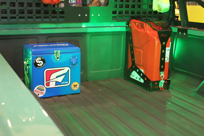 The bed carries a spread of functional gear, including a Harbor Freight gas can on a Motobilt mount.