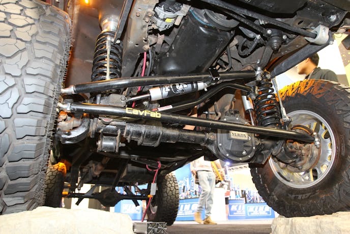 Brad kept the Dana 30 front axle but ditched the weak, trouble-prone front axle disconnect (FAD) system. In its place, he installed a one-piece passenger-side chromoly shaft from Crown Automotive and sealed the axle tube with a CavFab FAD Delete Plate. He also added a Yukon Dura Grip limited-slip, a Yukon diff cover, CavFab crossover steering, and a RockJock Antirock sway bar.