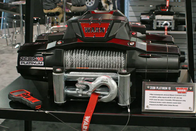 IMG_0190We spoke with Rob Hawkins at Warn for more details. “Our new ZEON Platinum winch line, which includes the 10 (10,000 pounds), 12 (12,000 pounds), and 10s (10,000 pounds with synthetic cable) offers 20-percent faster line speed than before, and IP68-rated waterproofing that allows the unit to operate even after it’s been submerged for 30 minutes.”