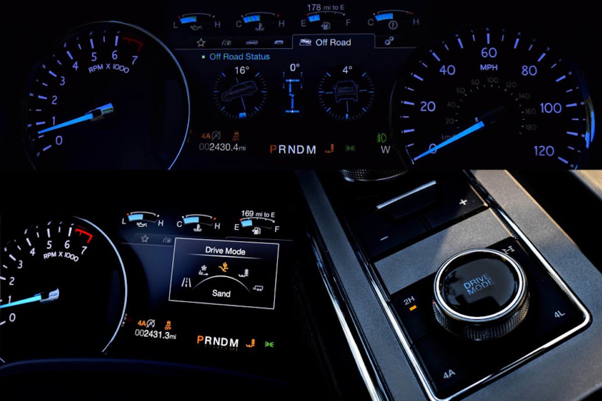 Toggle through the digital driver display within the cluster, and you’ll find off-road vehicle articulation monitoring, as well as a bevy of traction settings. Utilizing Ford’s proven Terrain Management System gives you the ability to select up to seven preset modes for tackling everything from deep ruts and mud, to sand and snow, as well as on-road tasks like towing. It’s the same setup that has made the F-Series FX4 such a star when it comes to grip, earning this version of the Expedition big points in our review book.