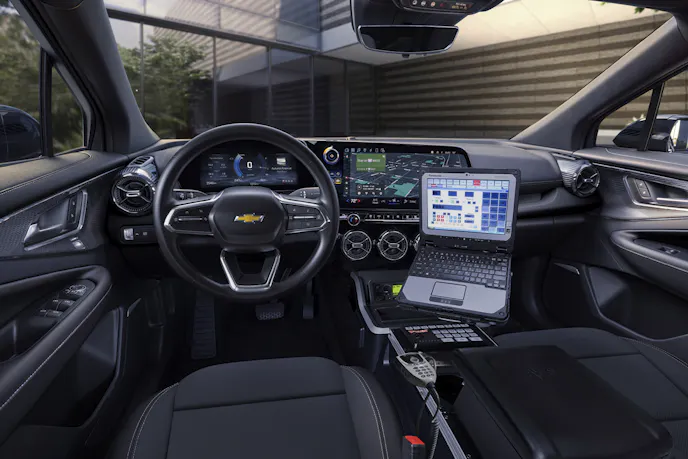The SUV’s interior includes a police-specific front seat designed to accommodate duty belts and wearable gear. The steering wheel has unprogrammed buttons. This allows upfitters to connect a push-to-talk function for department radios and fingertip operation of emergency warning equipment. To help accommodate gear, the Blazer EV PPV offers a larger rear cargo capacity. Removing the civilian Blazer EV’s false floor allows for the installation of aftermarket cabinets and organizers. The Blazer EV PPV 9C1 police package has standard rubberized vinyl flooring, a police-spec center console, and a vinyl rear seat. A 93C Detective Package is also available and features carpeting, the regular-production center console, and cloth rear seats. Additionally, with police-level electrical loads in mind, the PPV has a number of upgrades. Specifically, a dedicated electrical center, standard upfitter wiring harnesses, and enough power for law enforcement equipment.