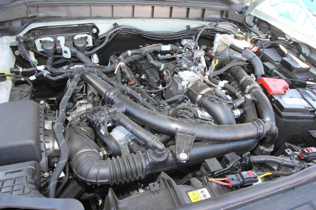 Under the fiberglass Cervinis Stalker hood with a center scoop is a 2.7-liter EcoBoost V6 engine. It’s been upgraded with a Banks PedalMonster throttle controller, which Gustavo says eliminated the accelerator-pedal delay and put a real “pep in its step.” The exhaust has been upgraded with a Gibson Black Elite Dual Split Exhaust, which uses 409 stainless tubing and black T304 stainless tips. Finally, an Odyssey battery helps provide improved amperage for the Bronco’s increased electrical needs, which include an array of aftermarket lighting. Power is routed through the stock 10-speed automatic transmission and two-speed transfer case with 3.0:1 low-range gearing.