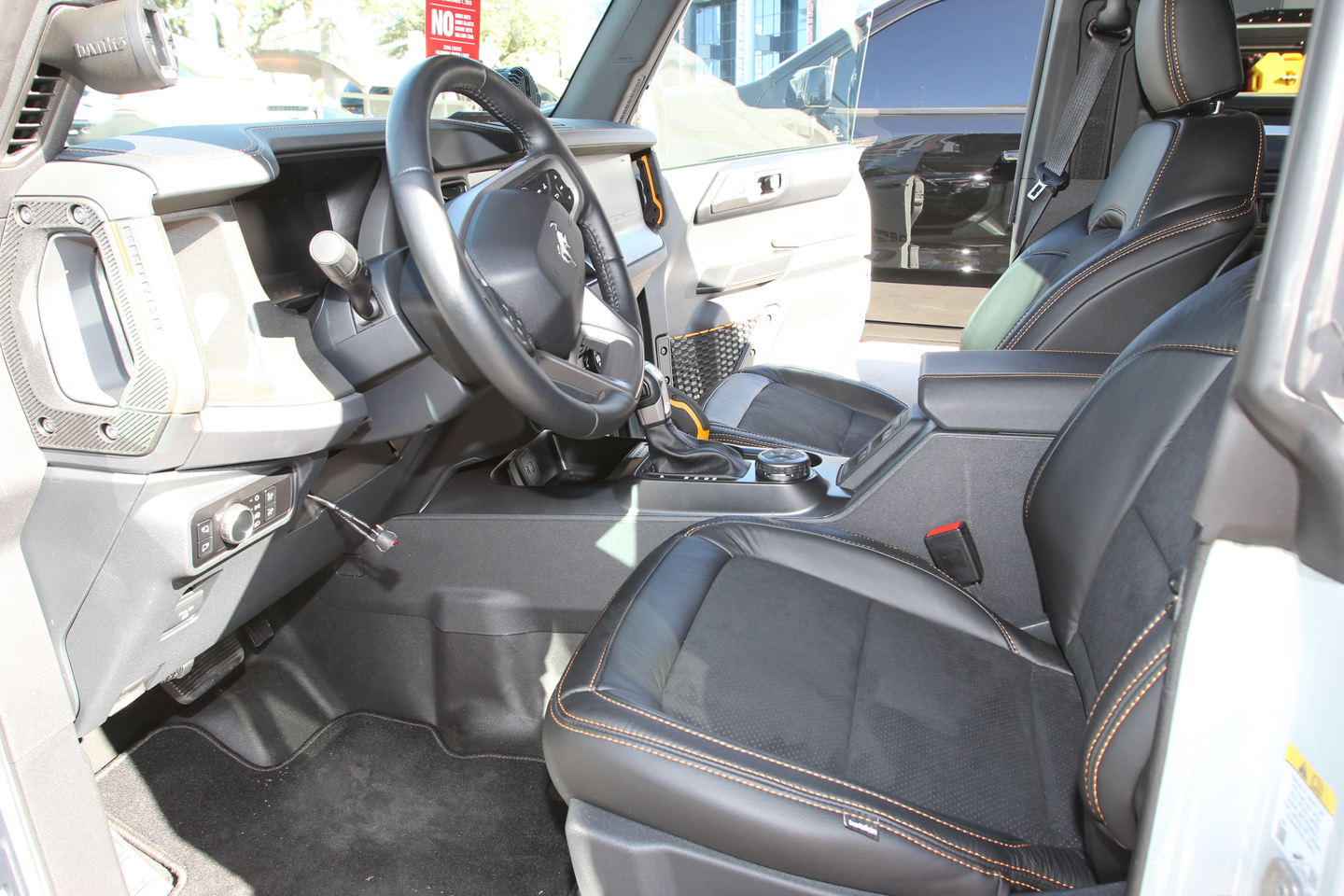 The factory axles, with their 4.70:1 gearing and differential lockers, met the couple’s needs and were left intact. However, the suspension was significantly upgraded with a Belltech 4- to 7.5-inch lift kit with Trail Performance coilovers. The kit includes a number of upgraded components and even features two 1/4-inch-thick skidplates, which are ideal for protecting the underbody during the Bronco’s future trail forays. Gustavo says he set the front coilovers at the highest level of 7.5 inches and the rear coilovers at 6.5 inches. These settings allow the 37×12.50R20LT Mickey Thompson Baja Boss A/T tires to move freely within the wheelwells. The tires are mounted to 10-inch-wide Fittipaldi FB153 beadlock wheels. The factory beadlock hardware was replaced with bolts from ARP, and Bartec TPMS sensors allow Gustavo to monitor the Bronco’s tire pressure.