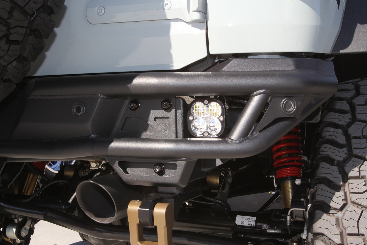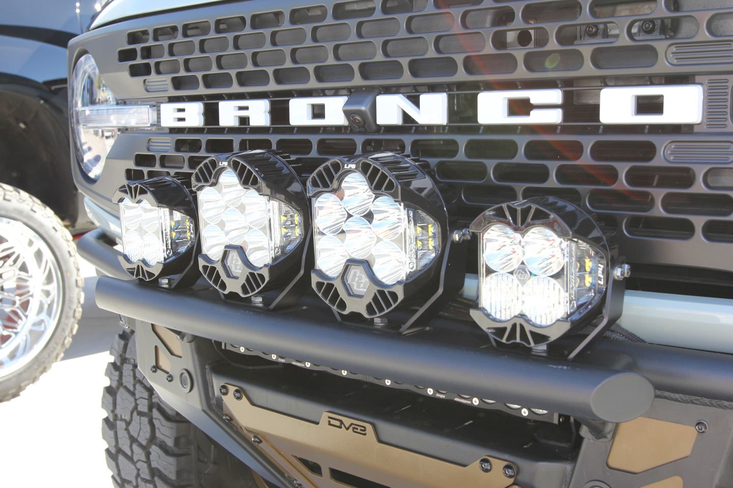 The Bronco’s exterior is fitted with a variety of upgrades designed to improve its functionality off-road and offer benefits for daily-driver duty. Fore and aft are DV8 Offroad Tube Series bumpers, and the front bumper is fitted with the optional bolt-on light hoop. On the topic of lighting, the SUV carries a contingent of Baja Designs LED lights, including 14 forward-facing and two rear-facing units. Additionally, other exterior mods include Boost Auto Lumastep M2 Powered Light Up Running Boards, an RCI Off Road roof rack, AM Off-Road Raptor Style LED taillights, and Maxtrax traction boards. Also included are products by Bolt Lock, Pelican, and Gen-Y Hitch.