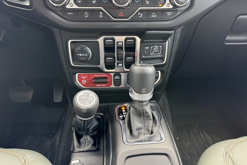 Choosing the Mojave X package is equivalent to “checking all of the boxes.” Functionally, this adds a steel, winch capable, front bumper; steel rear bumper; full-length steel rock rails; a forward-facing trail camera; and a full-time transfer case. From a styling standpoint, X adds a body-colored hard top and fenders along with a leather-trimmed interior and the most premium Uconnect 5 with navigation infotainment system. The package adds about $10,000 to the price of the Gladiator Mojave.