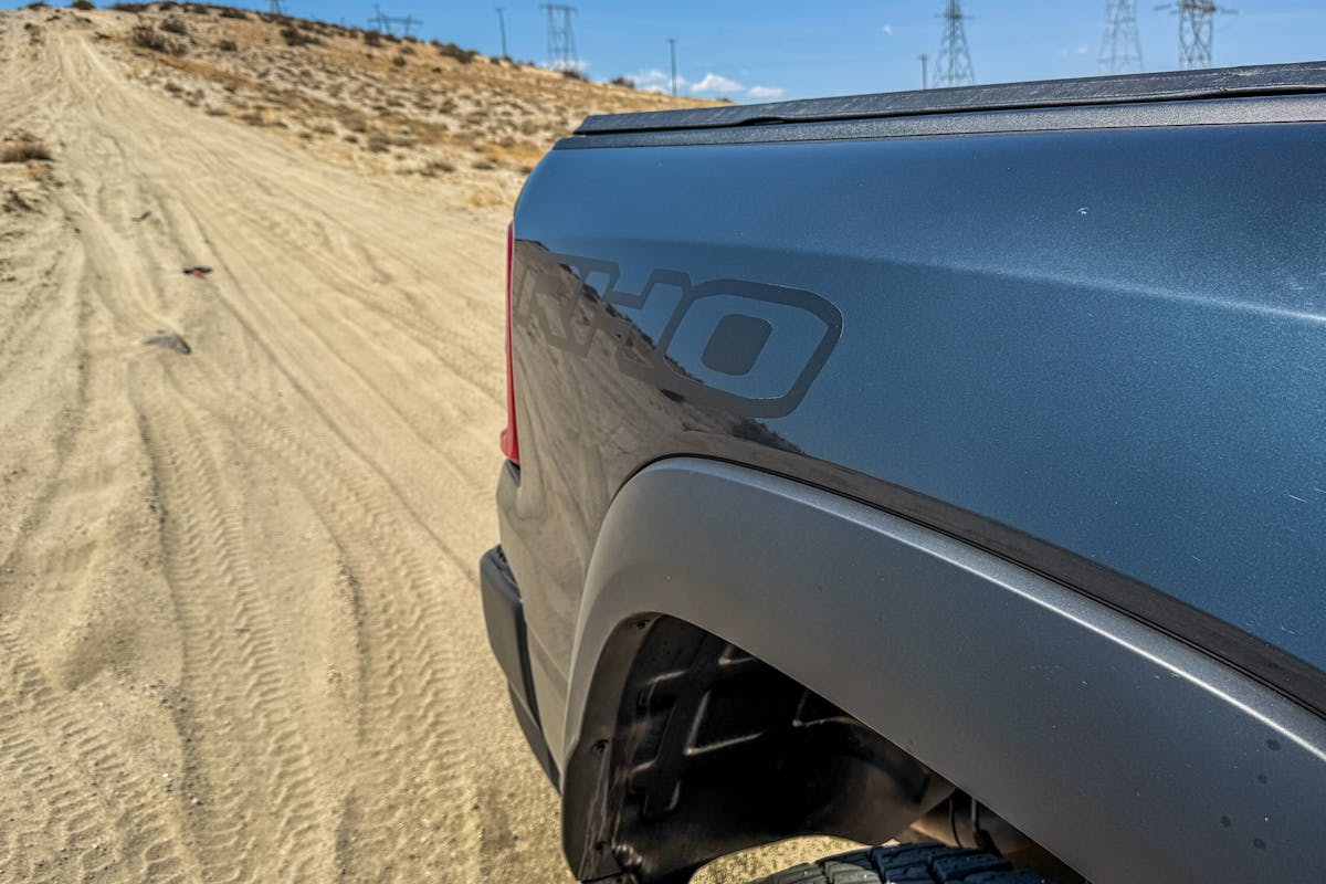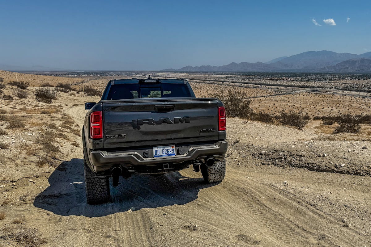 Ram has the RHO’s off-road drive modes dialed, with Baja being our favorite. Switching into Baja not only increases throttle sensitivity and alters the transmission shift points, it also changes the damping strategy for the Bilstein shocks and diverts power through the transfer case to a 25/75 split, with the majority going to the rear. This leads to the ability to whip wicked donuts until you’re green in the face. The rear locking differential is also able to remain active in high range through the entire speed range, which allows the truck to get through deep sand, silt, and mud with no issue.