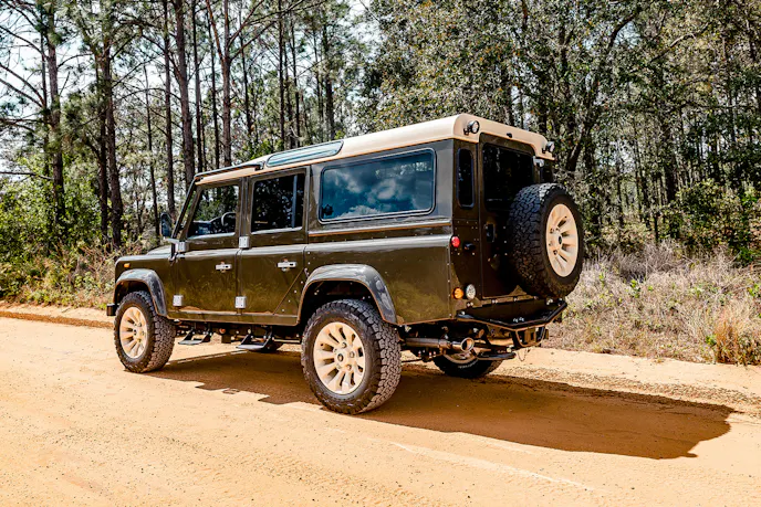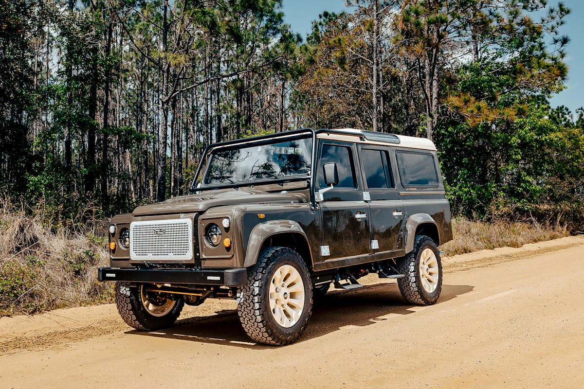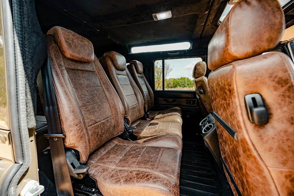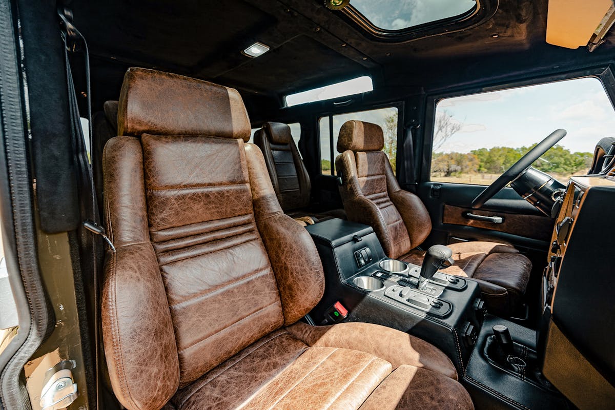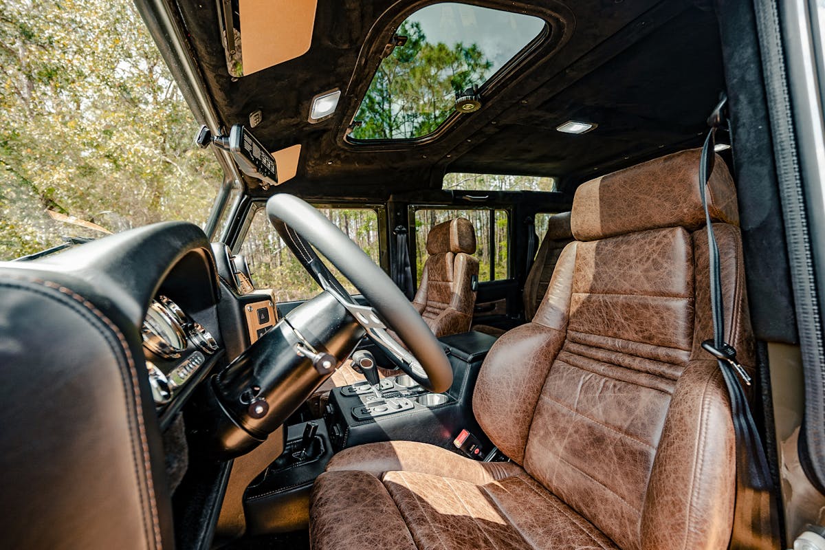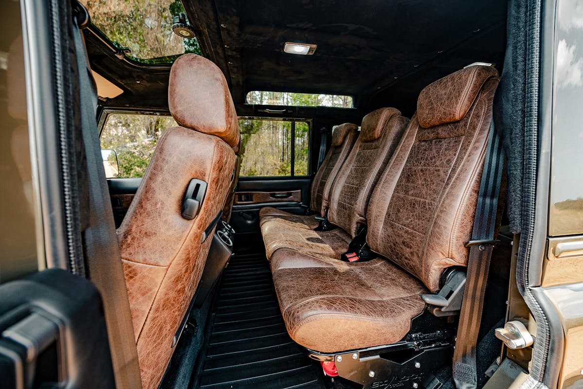 Slip inside and the story shifts from rugged utility to tailored sophistication. The driver is greeted by RECARO Orthoped seats wrapped in deep chocolate brown leather, while Exmoor and traditional bench seating carry the same finish throughout. Heated and cooled front seats, a factory Land Rover sunroof, and French Oak wood accents elevate the space, balancing tradition with contemporary craftsmanship. Even functional details like the satin-finished, hydro-dipped radio console and hidden lock box are designed with equal parts utility and elegance in mind.