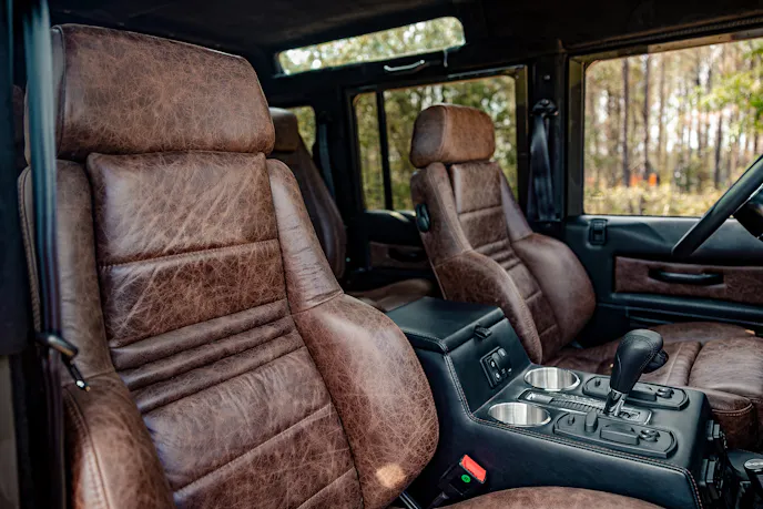 Slip inside and the story shifts from rugged utility to tailored sophistication. The driver is greeted by RECARO Orthoped seats wrapped in deep chocolate brown leather, while Exmoor and traditional bench seating carry the same finish throughout. Heated and cooled front seats, a factory Land Rover sunroof, and French Oak wood accents elevate the space, balancing tradition with contemporary craftsmanship. Even functional details like the satin-finished, hydro-dipped radio console and hidden lock box are designed with equal parts utility and elegance in mind.