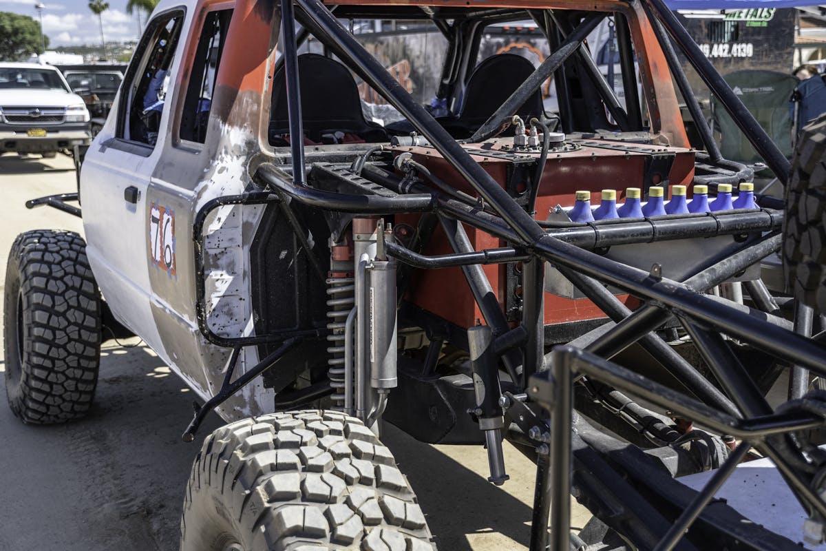 “The plans for this one started on a napkin,” he laughed, pointing to an unclad, home-built truck brandishing a set of poster-board race numbers taped to the side. “I built it in the backyard under an EZ-up just like this,” referring to the pop-up canopy atop his flatbed trailer. “It’s crazy how much you learn building one and there is always room for improvement,” he said.