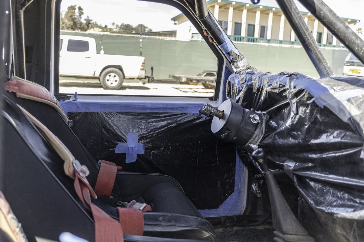 When you peek into the interior, it’s all business, with most of the stock amenities removed to make room for the extensive roll cage. What remains is wrapped in plastic, pending the scheduled day at the paint booth. A pair of PRP racing seats finished in black vinyl take center stage in the cab. A set of Crow racing belts ensure the occupants stay firmly planted in those seats when the asphalt gives way to the dirt. Noticing something was missing, a glance at the nearby trailer revealed an MPI Innovations steering wheel awaiting the next run.