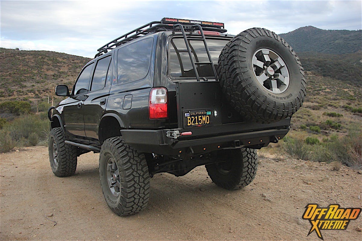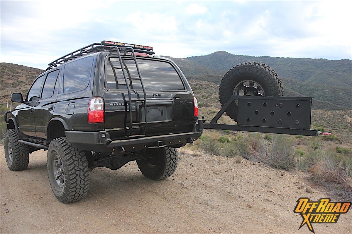 CBI's rear bumper with tire carrier has several mounting locations for the spare tire to affix to, making it versatile and well-suited for the 4Runner and its Gobi roof rack with ladder.