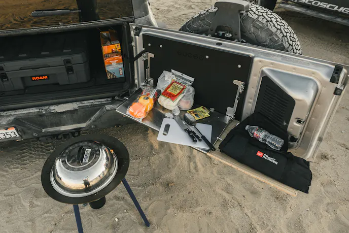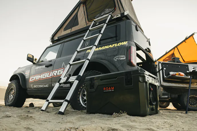 What else do you need to extend your desert adventures into the multi-day format? A couple of Go Fast Campers Platform RTT, and Camper Platform to rest the head and keep out of the elements. An arrangement of 5.11 Outdoor Gear to tromp through the harsh desert environment. Some ROAM Rugged cases of various sizes to haul all the gear in an organized fashion. A Tembuk Tusk Adventure Skottle to cook up hot meals. And some good food and drink to keep the good times rolling.