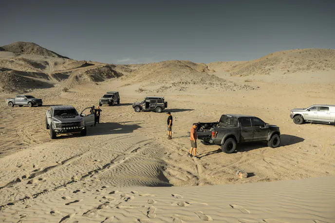 The Camburg crew had just about the choicest vehicles on their Anza Borrego desert adventure. We spy a Ford Raptor R, a Ford Raptor decked out for go-fast overlanding, a Ford Bronco Raptor, another tricked-out Ford Bronco, a full-size RAM 2500, and a few more trucks built for fun daily driving.