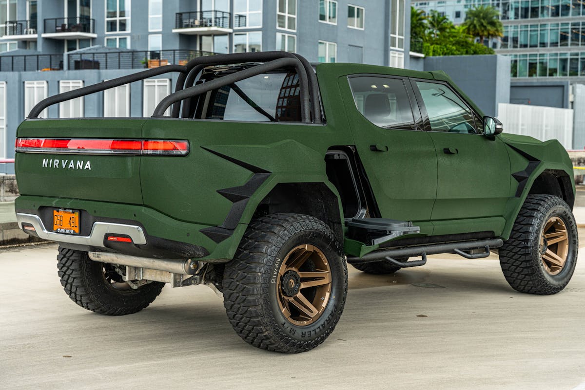 A Nirvana owner will probably never struggle to remember where their truck is parked. Just look for the crowd. Part of that is due to the custom bodywork. And creating the bodywork was no easy task. Thickness is critical and all the Rivian’s technology, like cameras, ultrasonic sensors, and radar units, were retained and positioned correctly. Out back the wheel openings were enlarged while up front the stock fenders were replaced with custom units that have larger wheel openings. The larger wheel openings ensure that the big 38×15.5R20LT mud-terrain tires on 12-inch-wide Fuel wheels could travel without contacting the truck’s body. The front bumper and hood are custom made. A custom Kevlar material is used for the Nirvana’s finish and it helps protect the truck from scratches and rust. As a bonus it’s said to be easy to clean.