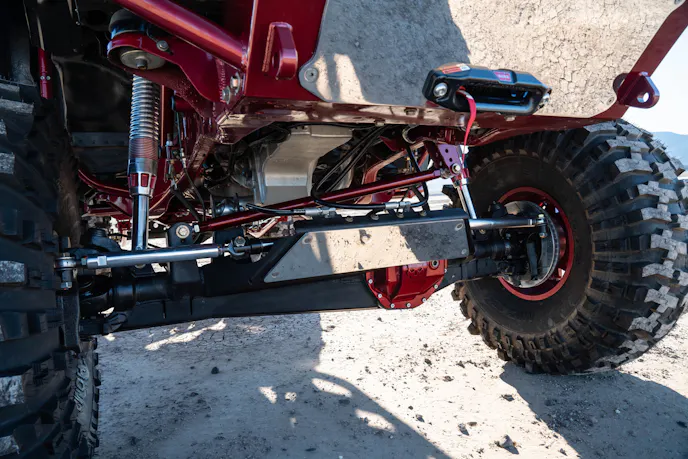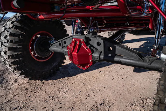 Rather than repairing the trashed independent front suspension and factory rear axle, Cody swapped in a solid front axle and a stronger rear end. Out back sits a GM 14-bolt sourced from a 2006 3/4-ton GM truck. The housing is reinforced with a Ballistic Fabrication truss kit and capped with a Ballistic differential cover. Internally, it runs an Eaton Detroit Locker and Revolution Gear & Axle 4.88:1 gears.