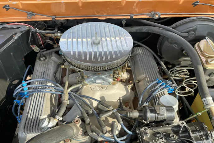 Under the hood is a rebuilt 429ci V8 big-block engine that Delbert purchased from a private seller. He disassembled the engine and sent it to Terrel Automotive Machine in Salem, Indiana, for the machine work. The completed engine is simple by today’s standards, yet powerful. It’s fitted with flat-top pistons and a high-rise, dual-plane Weiand Stealth intake. Bolted to the intake is a Holley 750 cfm four-barrel carburetor with vacuum secondaries and a manual choke. Exhaust gases are whisked away through a set of L&L Products fenderwell-exit headers with 3-inch collectors feeding dual exhaust. Other underhood equipment includes a Motorcraft distributor, a Ford F-250 radiator with a factory shroud, a mechanical fan, and an Optima YellowTop battery. It’s worth noting that the truck has functioning air conditioning to counter the hot Kentucky summers, and the engine is fitted with factory aluminum finned valve covers.