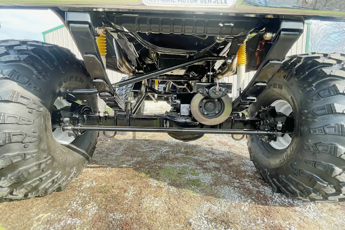 Engine power is routed through a rebuilt C6 three-speed automatic transmission sourced from a two-wheel-drive 1977 Ford F-150. Why a two-wheel-drive transmission? Well, that’s because the truck has a divorced NP205 transfer case feeding 2.5-ton Rockwell axles. The transfer case is mounted to an authentic Ford High-Boy rear cab mount/transfer case crossmember. The truck’s trio of driveshafts was fabricated by Republic Diesel Driveshafts in Louisville, Kentucky. The 2.5-ton Rockwell axles were purchased used and are full-width units with stock internals and new seals. Delbert installed a Boyce Equipment & Parts 2.5 Ton Pinion Mount Disc Brake Kit on each axle, which includes a rotor, caliper, mounting plate, hood, and hardware. He reports that he is using the factory brake reservoir and proportioning valve, and the truck “stops on a dime.” He also fabricated and installed mounts on the axles for the shock absorbers and torque arms.