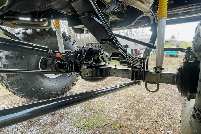 Delbert says that torque arms were part of the suspension plan from the beginning. Before upgrading to the Rockwell axles, the truck exhibited axlewrap when it was fitted with a leaf-spring suspension, a Dana 44 front axle, and a Dana 60 rear axle. Consequently, Delbert knew that torque arms would be necessary with the heavier Rockwells. Thus, he fabricated and installed an axle mount for each torque arm, as well as a stout mounting assembly for the center mount of each arm. He says the mount assembly is made from thick-walled 1.5-inch-diameter DOM tubing and 0.250-inch-thick plate. Each torque arm is 1.5 inches in diameter and fitted with Heim joints at each end.
