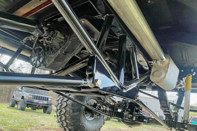 Time had taken its toll on the truck’s body, so, prior to the new paint, an array of new 1976 Ford F-100 body parts from LMC Truck was installed. The list includes both front fenders, both doors, the tailgate, and the outside door handles. Additionally, Delbert installed a used hood. Once the new parts were installed, the truck was sent to Greg’s Paint & Body in Bedford, Kentucky, for prep and paint. The shop also painted the truck’s frame after Delbert worked his magic to smooth it. It’s worth noting that Delbert created the frame using the original 1978 Ford framerails and engine and transmission crossmembers, the High-Boy rear body mount/transfer case crossmember, and four custom crossmembers. The factory dual steel fuel tanks were replaced with a 19-gallon polyethylene tank, specifically because it eliminates the corrosion that is common with steel tanks.