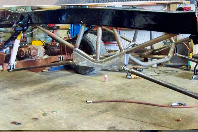Delbert says that torque arms were part of the suspension plan from the beginning. Before upgrading to the Rockwell axles, the truck exhibited axlewrap when it was fitted with a leaf-spring suspension, a Dana 44 front axle, and a Dana 60 rear axle. Consequently, Delbert knew that torque arms would be necessary with the heavier Rockwells. Thus, he fabricated and installed an axle mount for each torque arm, as well as a stout mounting assembly for the center mount of each arm. He says the mount assembly is made from thick-walled 1.5-inch-diameter DOM tubing and 0.250-inch-thick plate. Each torque arm is 1.5 inches in diameter and fitted with Heim joints at each end.