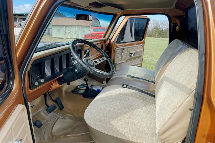 The truck has a simple leaf-spring suspension sourced from National Spring. The front springs provide 16 inches of lift, while the rear springs generate 10 inches. Delbert says that at the time he was building his 1976 Ford F-100, 16-inch-lift rear springs were unavailable, so he welded in 6-inch lift blocks to level the truck. Why so much lift? Well, the answer, in part, is the large 49×21/16.5LT Interco IROK bias-ply tires. The 49-inch diameter was chosen to work in conjunction with the 6.72:1 gear ratio of the Rockwell axles. These tires are U.S.-made, have a directional tread pattern, and a maximum load capacity of 3,640 pounds per tire. Each tire is mounted on a custom Boyce Equipment & Parts 15-inch-wide steel wheel. For a unique touch, Delbert fitted each wheel with a hubcap from an “‘80s-ish F-350 or E-350.”