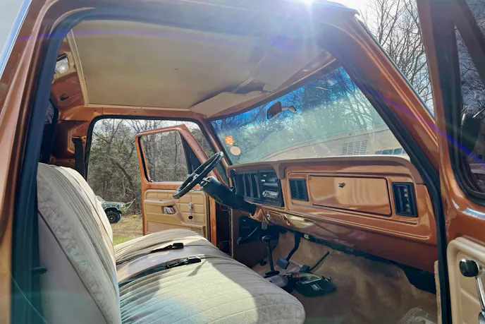 Inside, the 1976 Ford F-100 is restored to perfect condition, and it’s like a time capsule from the ‘70s. It features the factory gauges, a steering wheel pirated from a 1979 Bronco, and a tilt steering column from a 1978 F-250. The original seats have been reupholstered with a leather and cloth combination, and the metal on the dashboard has been color-matched with the truck’s exterior color. Additionally, the interior door panels, kick panels, carpet, and rubber door seals are all new pieces from LMC Truck. Rising from the transmission tunnel is the good ‘ol factory transfer case lever. Delbert also upgraded the truck’s audio system with an aftermarket head unit and speakers.