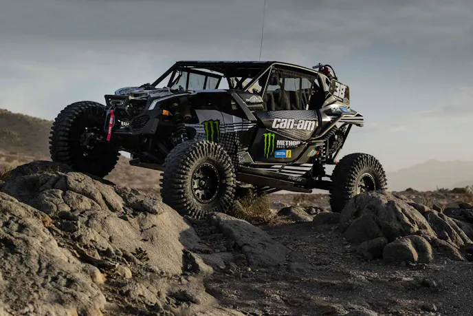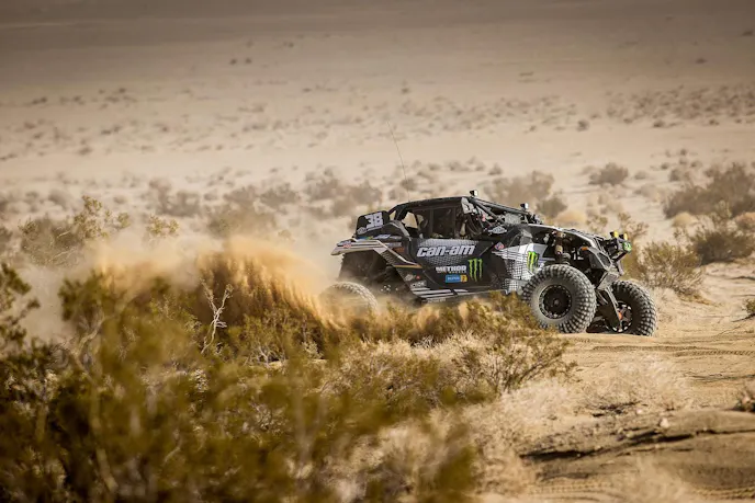 Brian Deegan driving his Can-Am UTV up on the King Of The Hammers stage after a successful 2023 race.