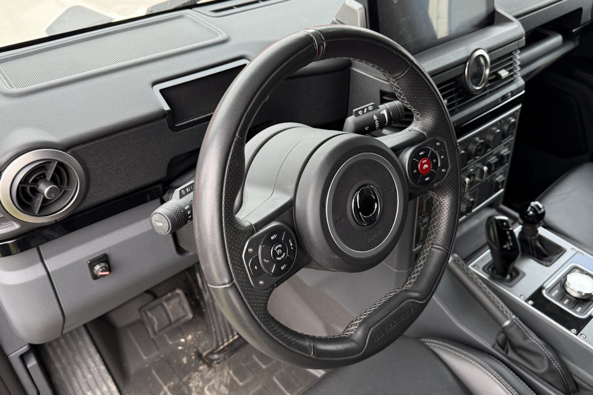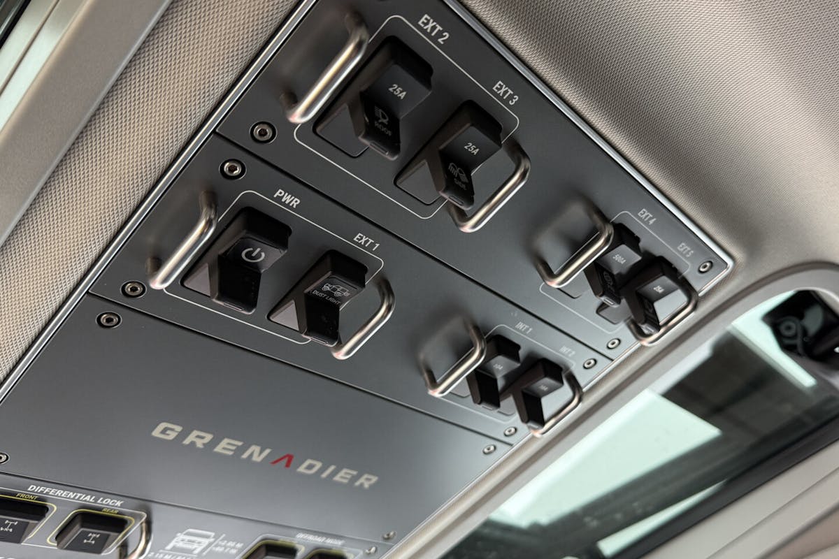 Aviation is a bit theme throughout the cabin. The center stack and roof-mounted auxiliary switch panel mimic those found in modern jets. The Grenadier lacks a traditional instrument panel and instead much of the vehicle’s instrumentation is located on a central infotainment touchscreen. Necessities such as speed, gear position, and odometer take up about a third of the 12.3-inch screen’s real estate. Modern conveniences such as wireless Apple CarPlay and Android Auto are standard as are advanced driver assistance features such as lane departure warning and automatic emergency braking.