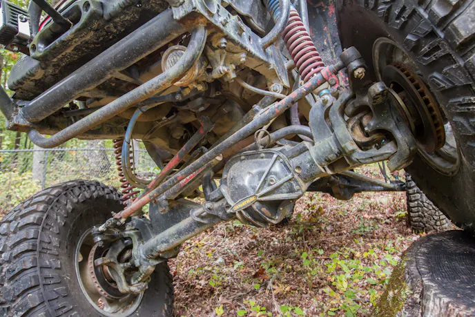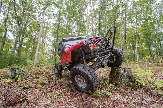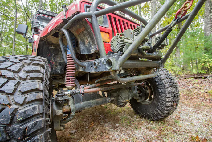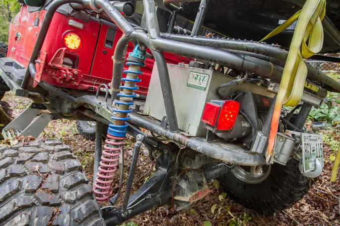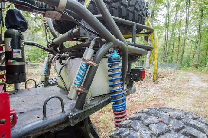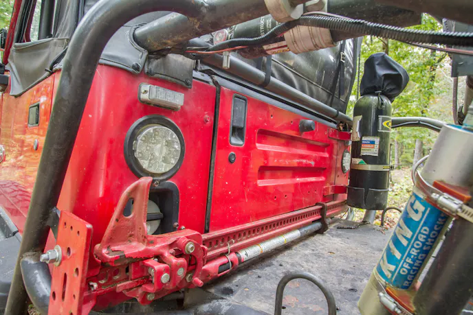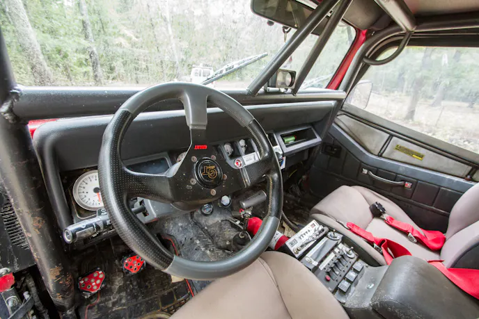 The suspension for the big Jeep is also fitted with trusted components. This approach serves to make sure Brandon and Sally make it over, around, or through whatever gets in their way. Fourteen inch King coil-overs exist on all four corners. The front features a three-link setup while the rear is a double triangulated four links. Limiting straps help prevent overextension of the YJ. Rock Ram hydraulic steering components make turning the big rig a breeze.
