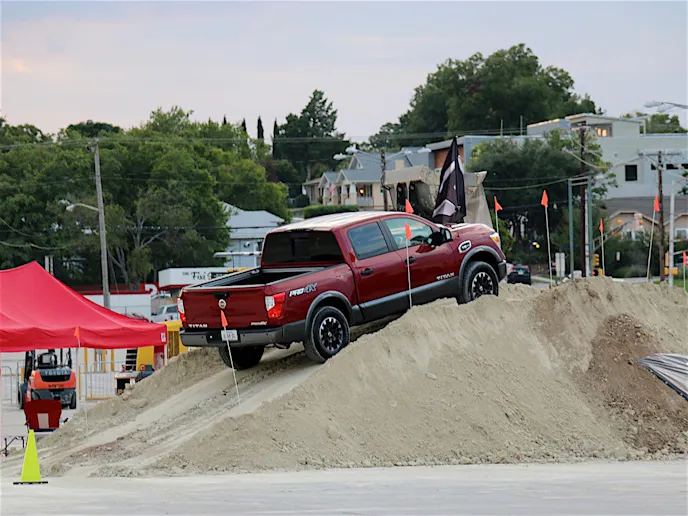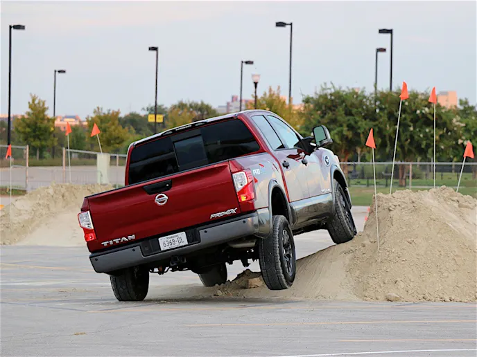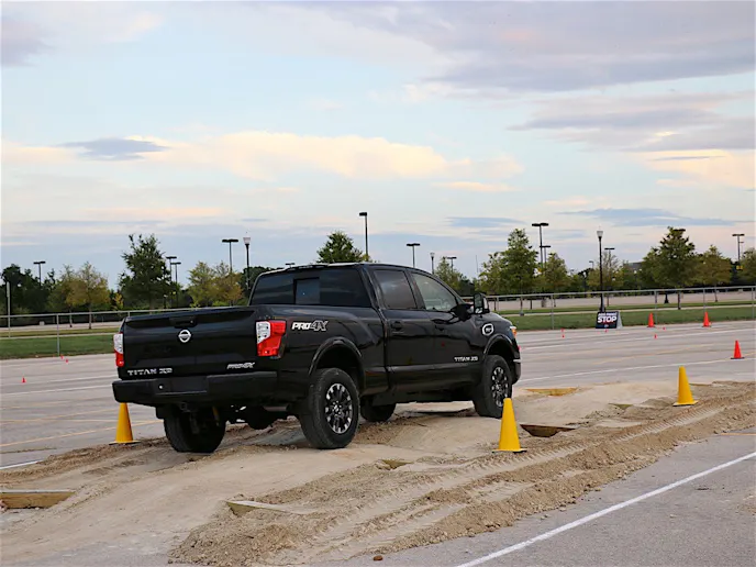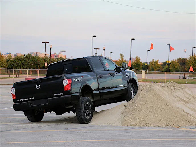 At the Nissan event in Fort Worth, the Titan didn’t jostle me around when I drove it over a stretch of sand-covered lumber. The Hill Descent Control worked flawlessly when I was coming down from a manmade peak.