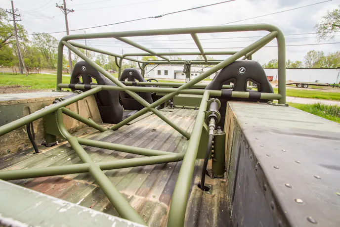 All of that horsepower is backed by a 4L80E overdrive transmission. The Mountain Machine staff then added PCS Paddle shifters to provide just that little bit of flair. Fuel flow is controlled by a Holley Terminator EFI system with a touchscreen display mounted in a custom bevel in the dash. “Everything modern had to fit,” Steve stated. “The first time we installed that bezel in the dash, it was black and I didn’t like it. So we painted it green and now I love it. All of those components have to blend in. You can have things like the touchscreen dash and Cadillac push-button start. But you have to take the time to do it right. The guys that serve in these vehicles don’t take the easy way out. Neither do we.”