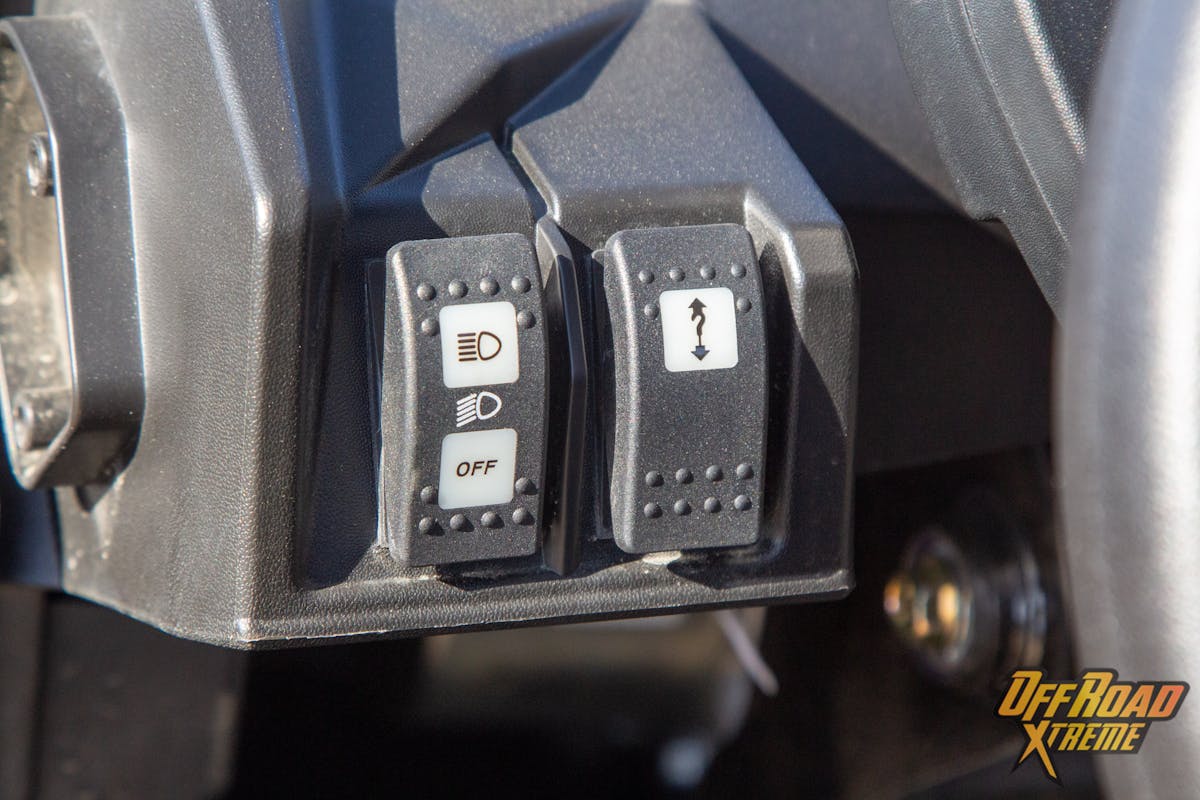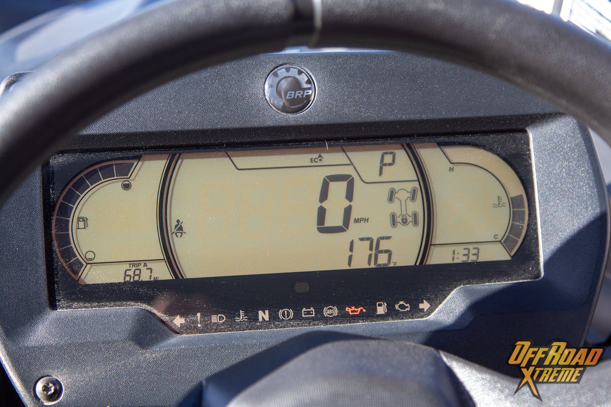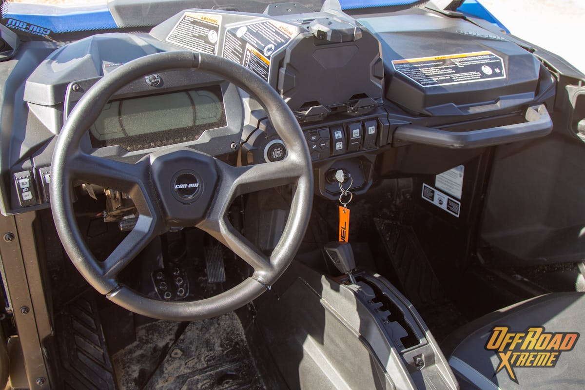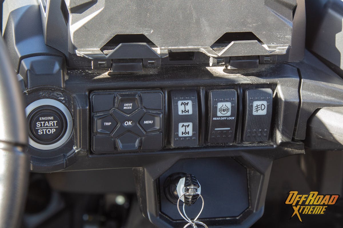 The Commander’s control center: Left of the steering wheel are two switches that operate the LED light bar, and the winch. The digital display tucked in behind the steering wheel presents fuel levels on the left, MPH indicator center, and engine temperature on the right. Much like a modern car display, you can determine what gear the vehicle is set to and there is a menu for you to toggle through to set up various trips, mileage, clock, and other parameters. The Can-Am Commander has all the warning lights clearly marked with familiar looking icons. On the right of the steering wheel, there is a push button start/stop that will only work when the Can-AM digitally encoded security key is present. The menu control center also houses the sport mode “fun button” we previously spoke of earlier. Next is the 4-wheel-drive/ 2-wheel-drive switch and the rear differential locker after that. The digital dash will indicate when the vehicle engages into 4-wheel-drive and when the differential is locked.