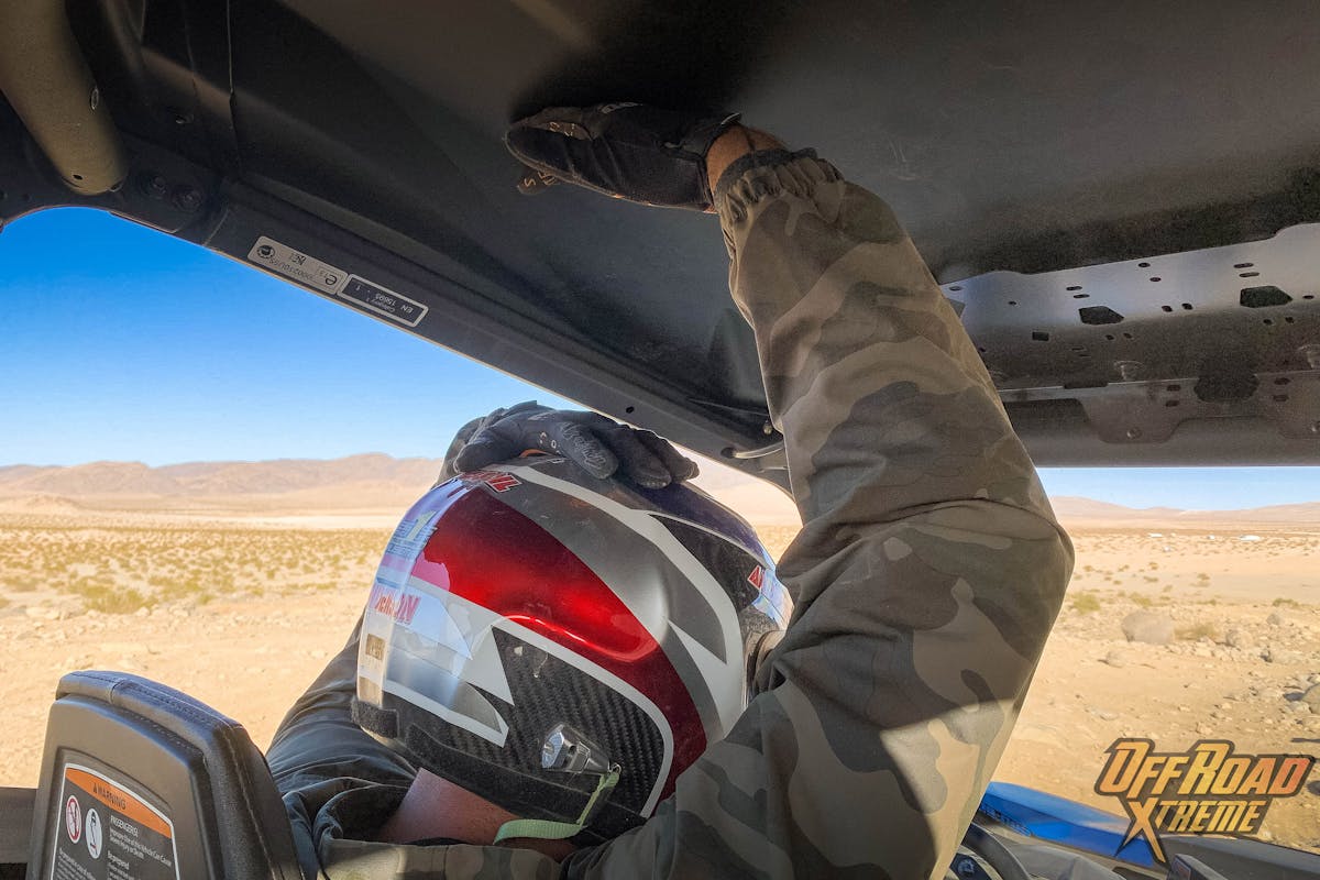 From the inside, I noticed a multi-purpose “cheese board” accessory plate ready to accept any number of Can-Am options or for the end users to easily add their own choice of equipment. Throughout the day of testing, I felt the same as David desperately wanting any form of rear view mirrors. As someone who stands at 6 feet 4 inches, I must say the roof & roll cage provided plenty of head room even with my helmet on. Sitting side by side with my equally large passenger, we both felt there was adequate room to comfortably accommodate us both without feeling cramped or interfering with the driving duties. The steering wheel has a mechanical tilt function and all the seat belts operate just like a normal passenger vehicle would; get seated, pull over from your shoulder, and lock it into the female receiver found in the middle of the UTV. Both myself and David did close the door on the seat belts multiple times as if the belts was supposed to retract, but instead they just dangled and could not get out of their own way.