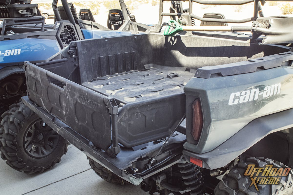 More exterior features on our Can-Am Commander included a front mounted winch hidden behind a full nose bull bar bumper, a full bodied skid plate, a roof mounted double row LED light Bar, and a rear cargo tray. I did realize that the Commander’s cargo bed featured a tilt & dump function but noted they offer a built-in bed extender also.