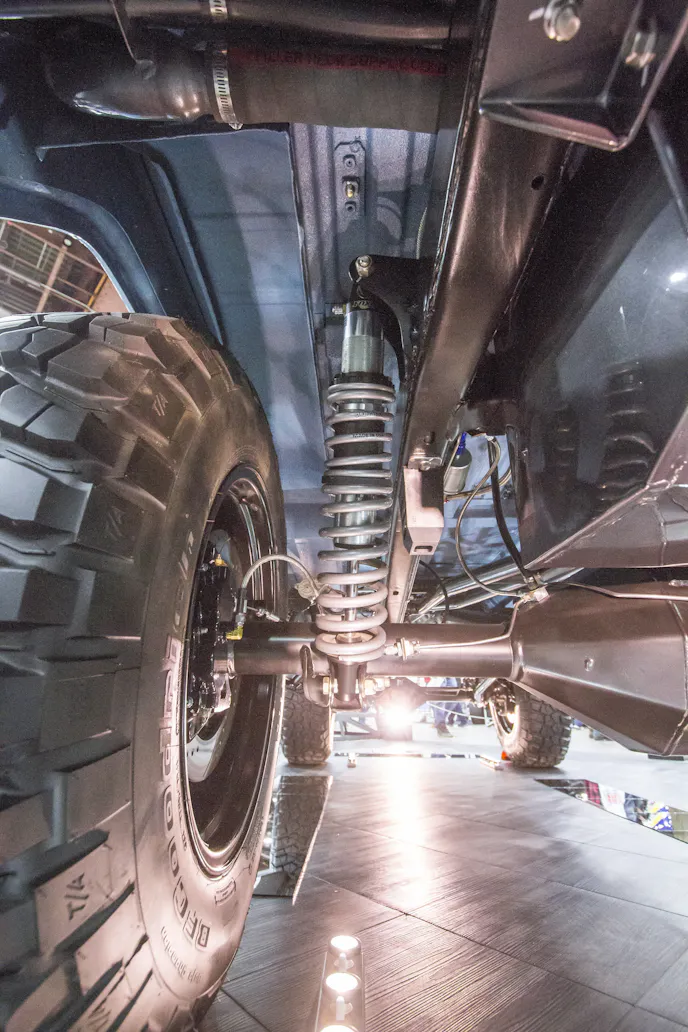 The front suspension features a four-link with long arms, so you can be certain that those 37s stay planted. The three-link rear with long arms handles the flex in the rear. Fox coilovers reside on each corner, so you know that the big Bronco can absorb any hits. A modular front clip was also added to ensure that any maintenance can be handled hassle free and to encapsulate that trademark grille we spoke about earlier.