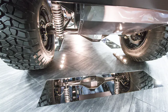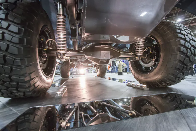 Most of us have had experience with the concept that if you want to go fast, you also have to be able to stop fast. To that end, Maxlider utilized Wilwood Superlite disc brakes to bring the big rig to a complete stop in an acceptable distance. Yukon Gear & Axle driveshafts and differentials, as well as Currie Enterprises front and rear axle housings ensure that things keep moving when the going gets tough.